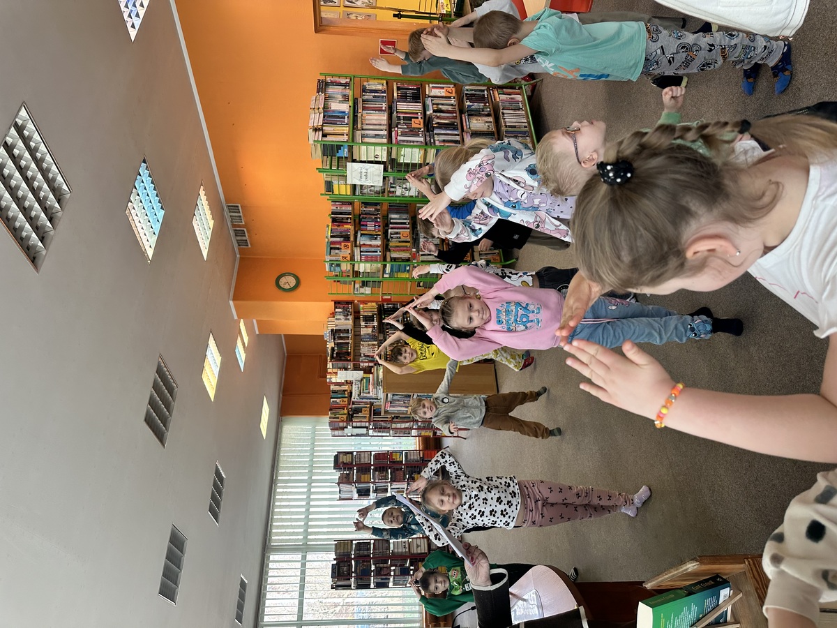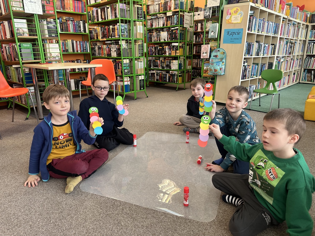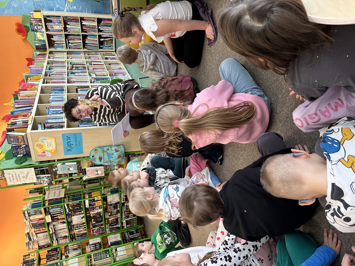 W dniu 27.02 grupa 4 udała się z kolejną wizytą do biblioteki przy Wilczej. Tym razem dzieci rozmawiały o książkach: jak powstają książki i jak o nie dbać. Przedszkolaki wysłuchały bajki o zmęczonej książce. Było też trochę ruchu. Podczas zabaw ruchowych dzieci odszukiwały ukryte w bibliotece zakładki. Na koniec same wykonały zakładkę do książki w postaci stonogi. To był fascynujący czas.