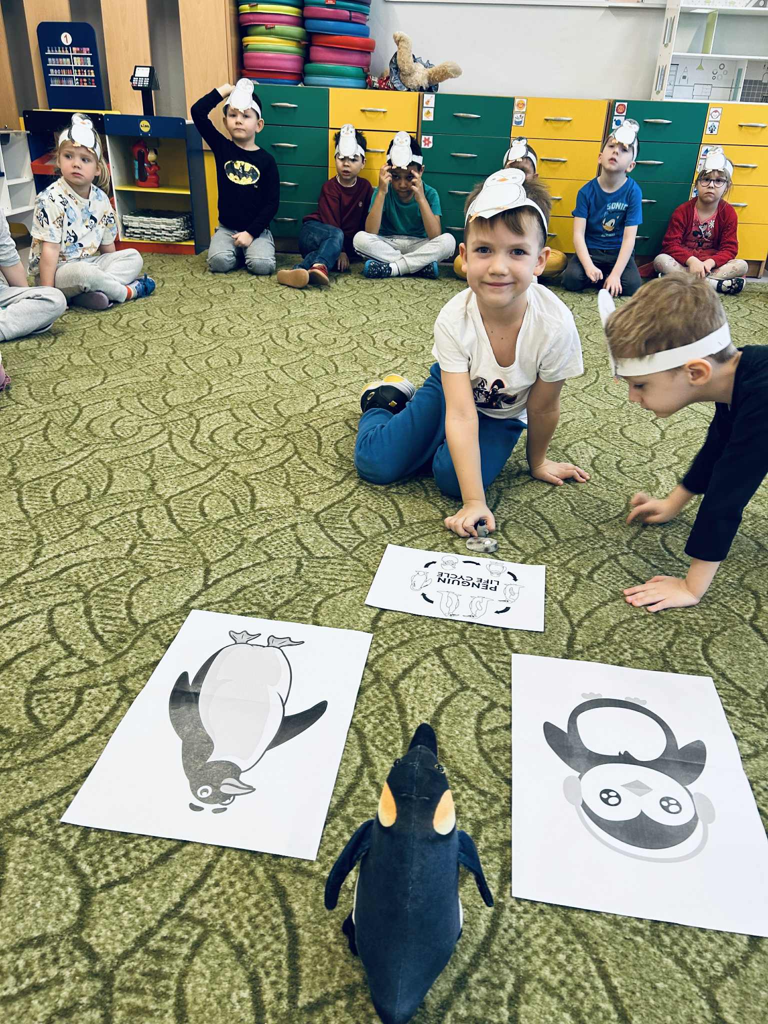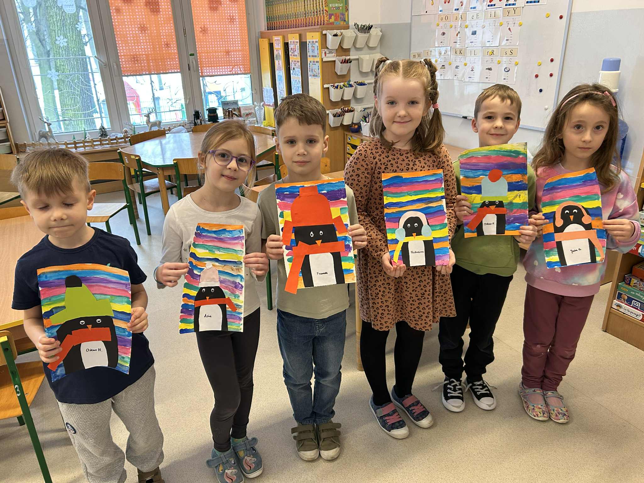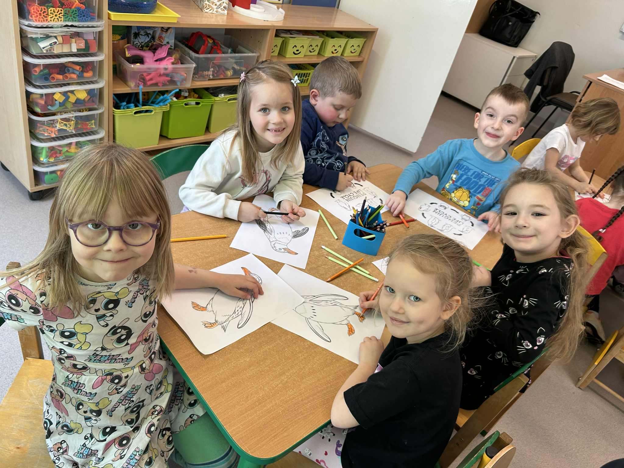 Podczas ostatnich zajęć z języka angielskiego realizowaliśmy temat: Dzień Pingwina. Dzieci z dużym zainteresowaniem poznawały cykl życia pingwina – od jajka, przez pisklę, aż po dorosłego osobnika. Uczyliśmy się nowych słów związanych z tym tematem. Podczas zajęć powtórzyliśmy także kolory, opisywaliśmy wygląd pingwina i jego otoczenie. Nie zabrakło również ruchowych zabaw tematycznych, które pozwoliły dzieciom wcielić się w małe pingwinki i utrwalić nowe słowa poprzez różnorodne aktywności.