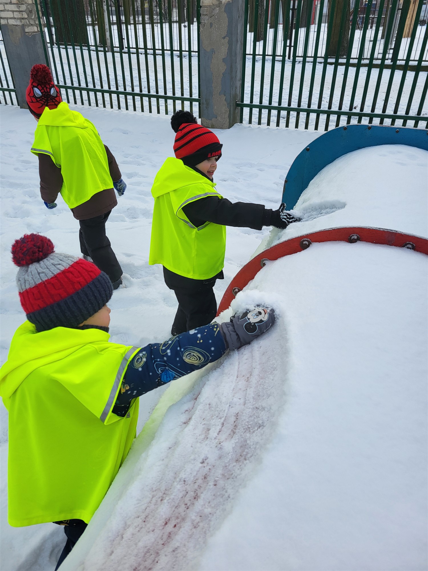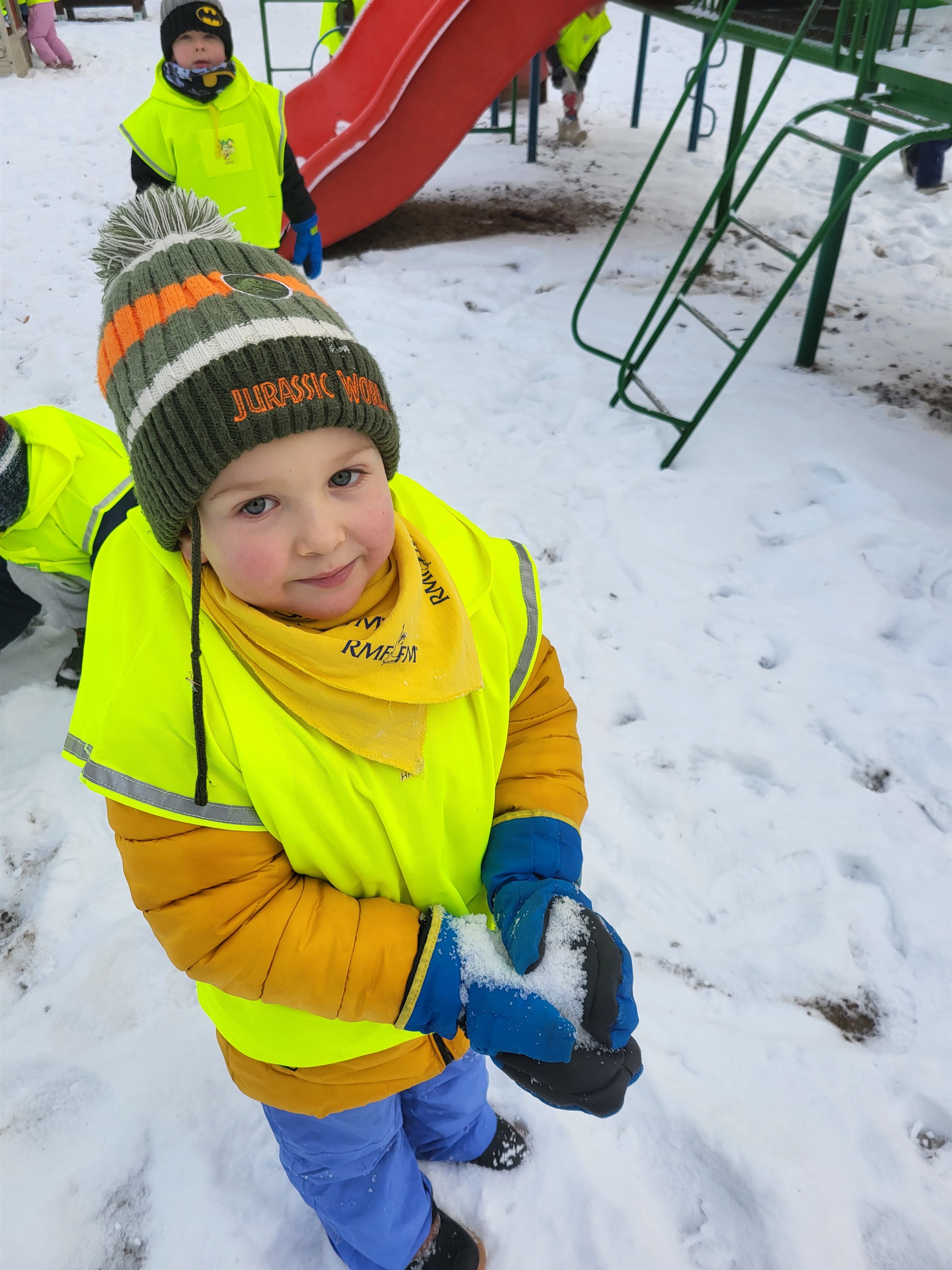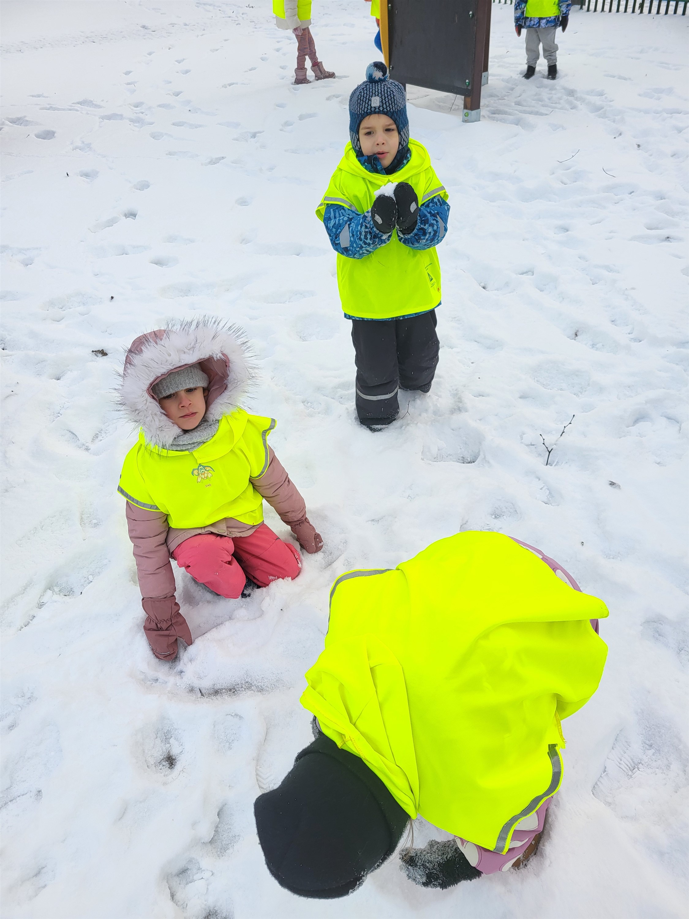 Zaraz po przerwie świątecznej nasza grupa wybrała się na krótki spacer nad pobliski staw w poszukiwaniu kaczek. Niestety kaczek nie spotkaliśmy, jednak znaleźliśmy miejsce pożywienia sikorek i wron. Pamiętaliśmy, że ptaków nie wolno karmić chlebem, który im szkodzi, dlatego mieliśmy ze sobą ziarenka odpowiednie dla tych zwierząt. Uzupełniliśmy karmniki, a pozostały pokarm rozsypaliśmy obok krzaczków. Po powrocie z krótkiego spaceru, odpowiednio ubrani, wykorzystaliśmy pogodę i rzadko widziany śnieg i ruszyliśmy do zabawy. Lepiliśmy śnieżki, ganialiśmy się i po prostu świetnie bawiliśmy. Byłoby super móc jeszcze to powtórzyć.