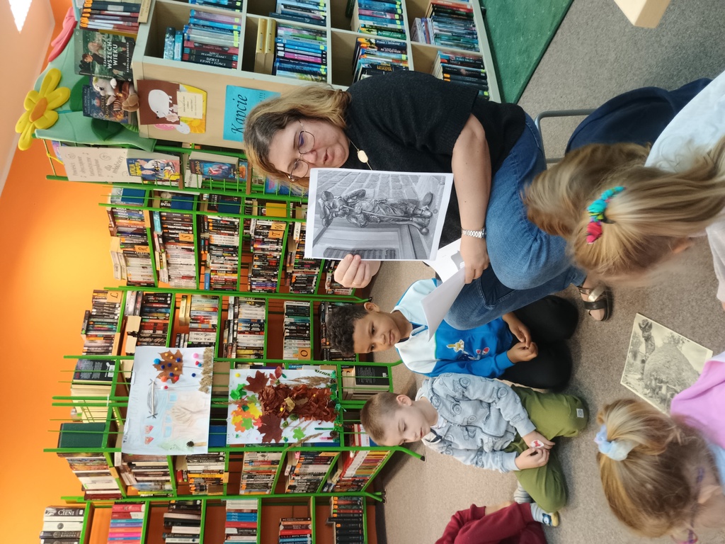 17 października udaliśmy się na zajęcia do zaprzyjaźnionej Biblioteki Miejskiej nr 55. Czekało tam na nas wiele niespodzianek. Poznaliśmy historię powstania Księżego Młyna oraz okolicznego Parku Źródliska. Odkrywaliśmy bohaterów Kociego Szlaku. Doświadczaliśmy włókienniczej historii Łodzi podczas zabaw z kłębkami i szpulkami nici. Na zakończenie kolorowaliśmy sylwetę młyna jako symbolu naszej najbliższej okolicy. Od dzisiaj Księzy Młyn stał się dla nas jeszcze ciekawszym miejscem.