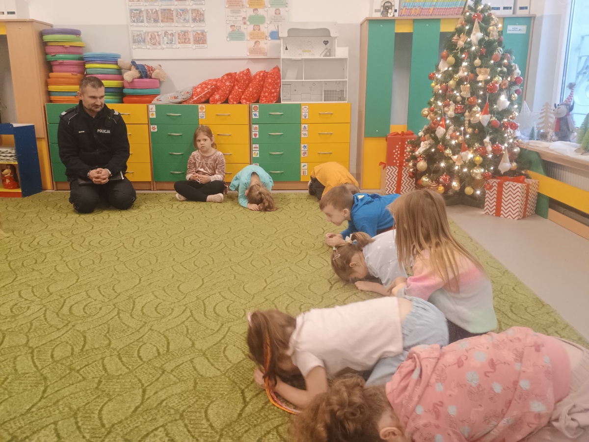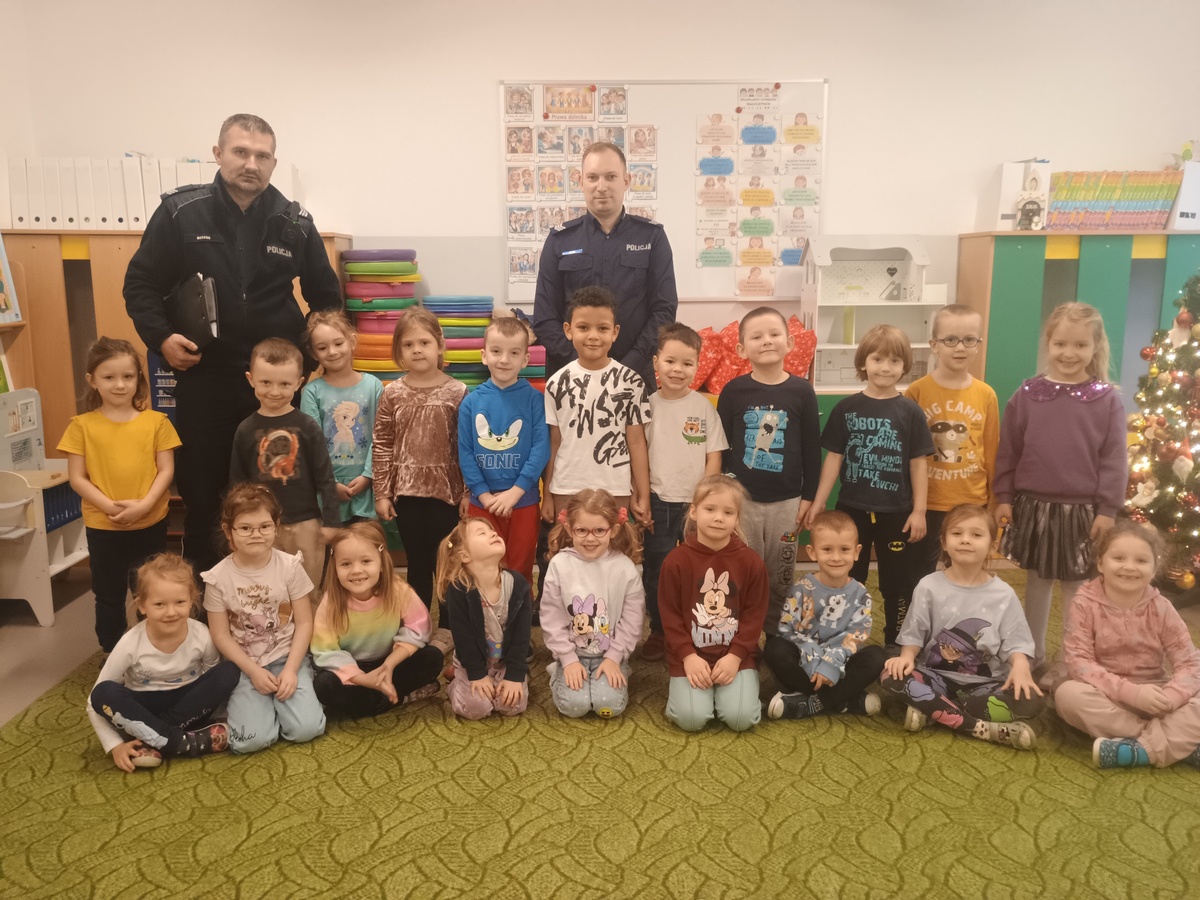 12 grudnia odbyło się w naszej grupie spotkanie z policjantami z Komisariatu Komendy Miejskiej Policji nr 6 w Łodzi. Wspólnie usystematyzowaliśmy wiedzę na temat zasad ruchu drogowego oraz zachowania bezpieczeństwa pieszych. Przypomnieliśmy sobie zasady zachowania w sytuacjach zagrażających naszemu bezpieczeństwu. Ćwiczyliśmy, jak zachować się w sytuacji kontaktu z nieznajomą osobą lub ataku psa. Zadając pytania naszym gościom, poznaliśmy ciekawostki dotyczące ich pracy. Na zakończenie spotkania oglądaliśmy prawdziwy radiowóz. To było bardzo ważne, ale i niezwykle ciekawe spotkanie.