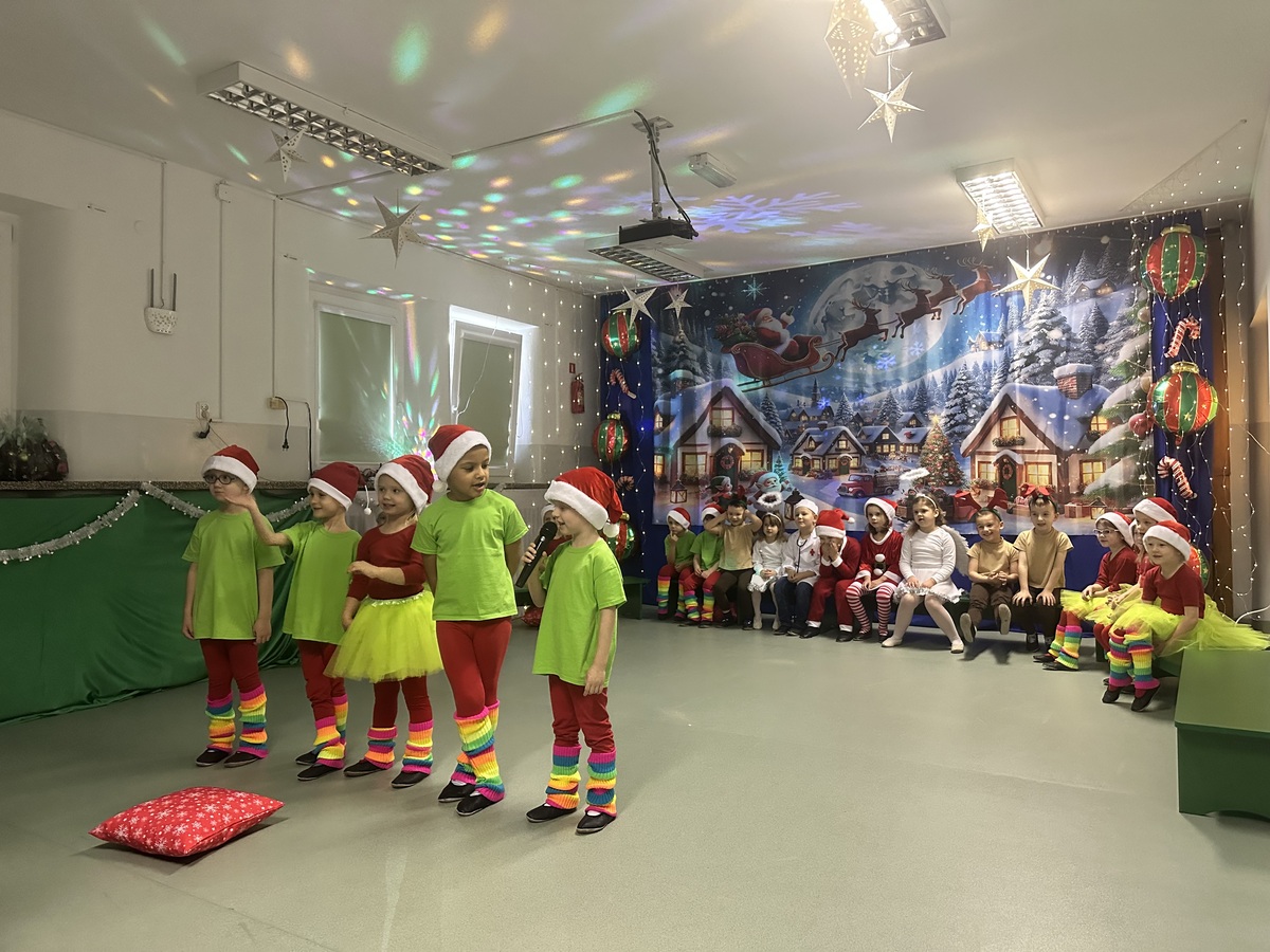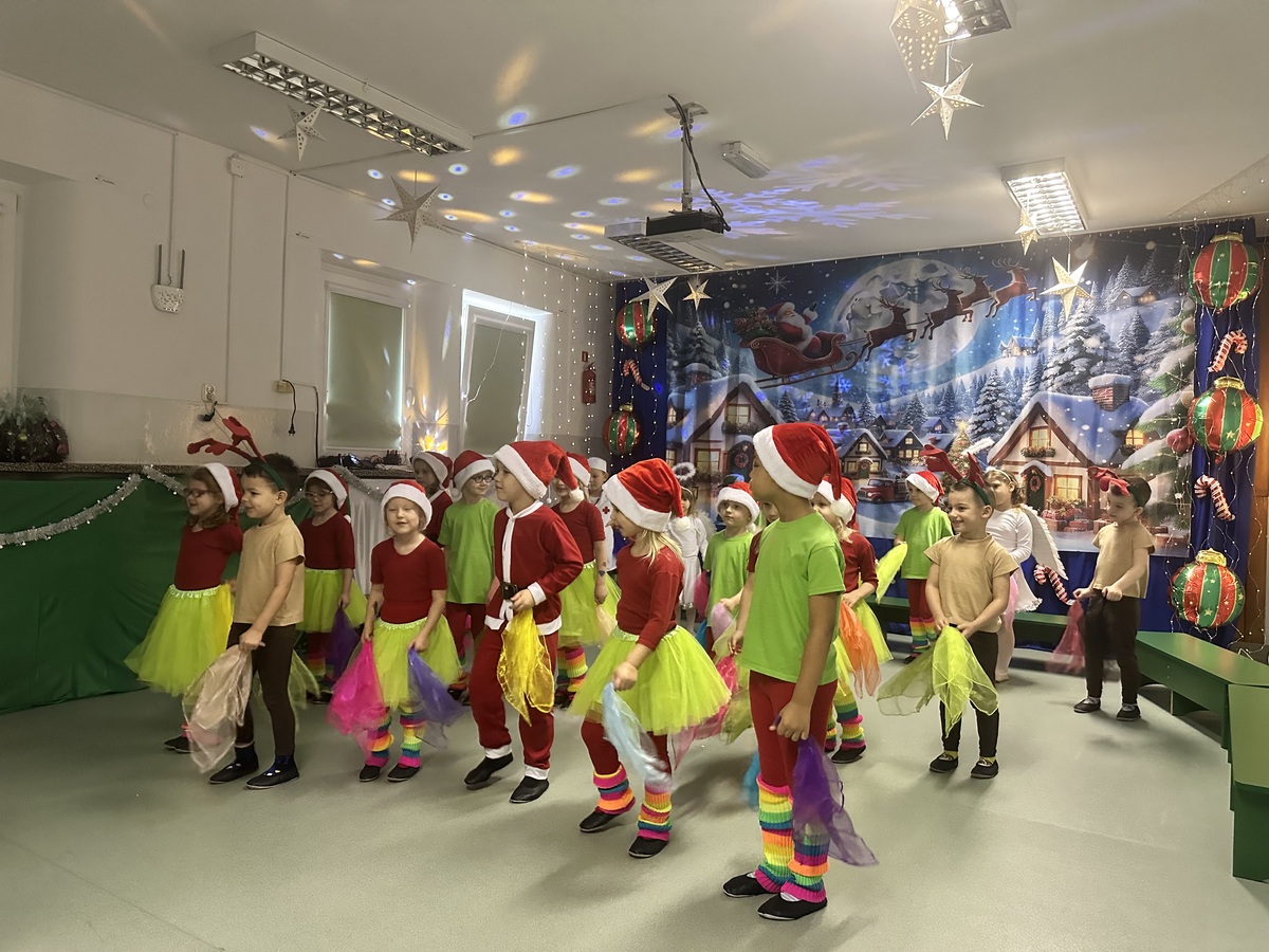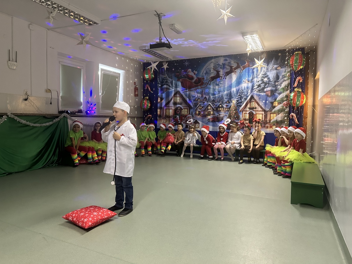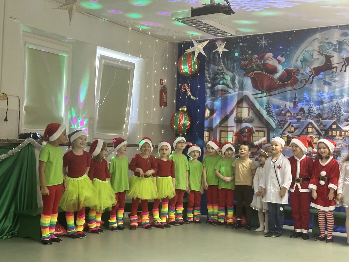 17 grudnia zaprosiliśmy naszych Rodziców na niezwykle spotkanie świąteczne. W zabawnym przedstawieniu pokazaliśmy co może się wydarzyć, kiedy elfy i renifery rozchorują się przed samymi świętami. W ferworze przygotowań Mikołaj wraz z żoną ratował świętą z pomocą aniołów. Dzięki usilnym staraniom wszystkie dzieci mogły otrzymać świąteczne prezenty. Dzieci z wielkim entuzjazmem śpiewały piosenki oraz wcielały się w role elfów, reniferów, Mikołaja, Mikołajowej oraz lekarza. Na zakończenie wszyscy wręczyli Rodzicom własnoręcznie wykonane wianki świąteczne, składając przy tym najlepsze życzenia. To był magiczny dzień.