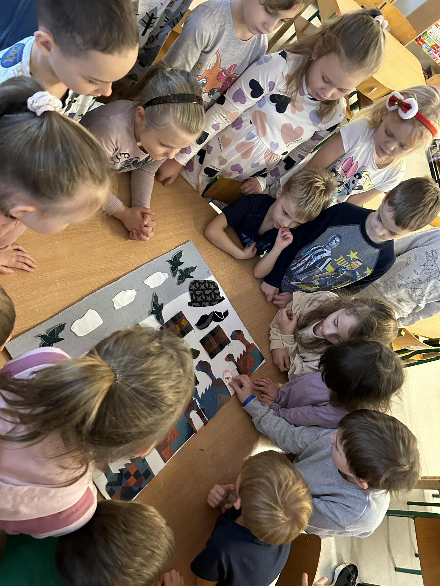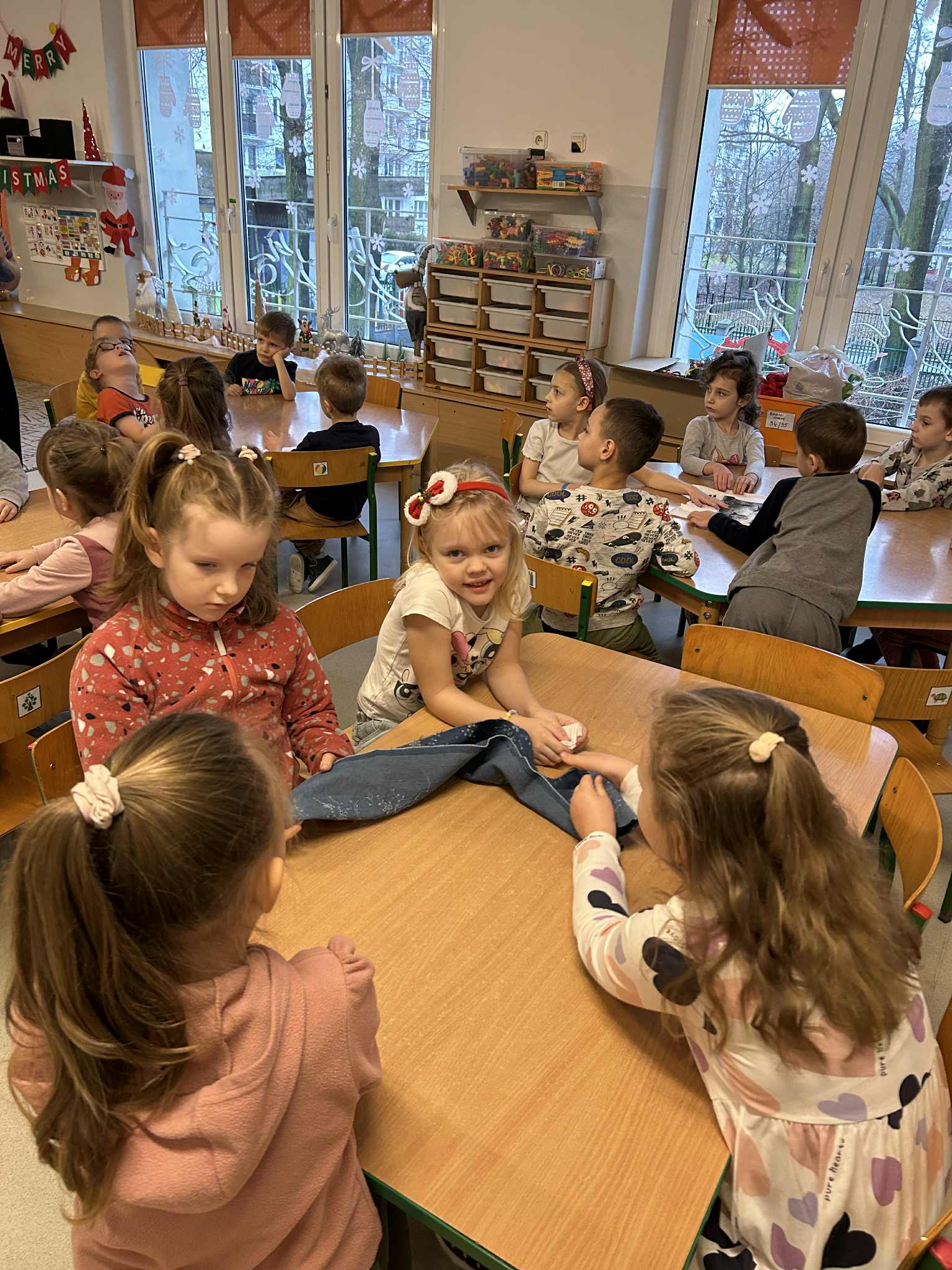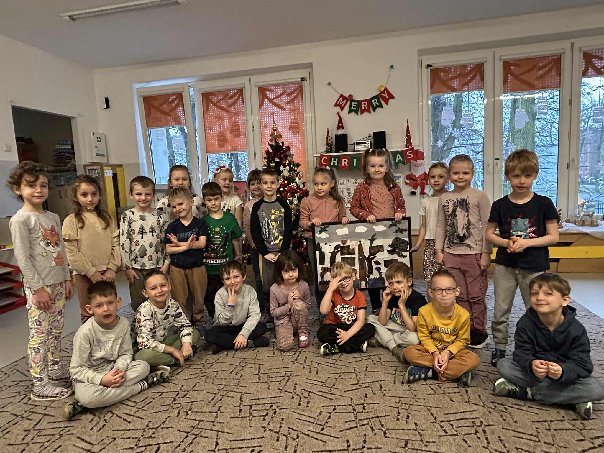 9 grudnia odbyły się warsztaty artystyczne, podczas których dzieci miały okazję oglądać i poznawać różnorodne materiały. Zajęcia pobudzały ciekawość, kreatywność oraz wyobraźnię dzieci. Na zakończenie dzieci samodzielnie stworzyły grupowy obraz, wykorzystując materiały różnego rodzaju. Wspólna praca przyniosła wiele radości i była doskonałą okazją do współdziałania oraz twórczej ekspresji.