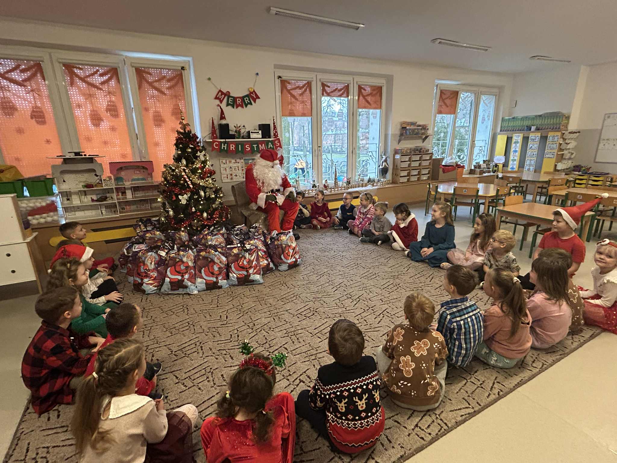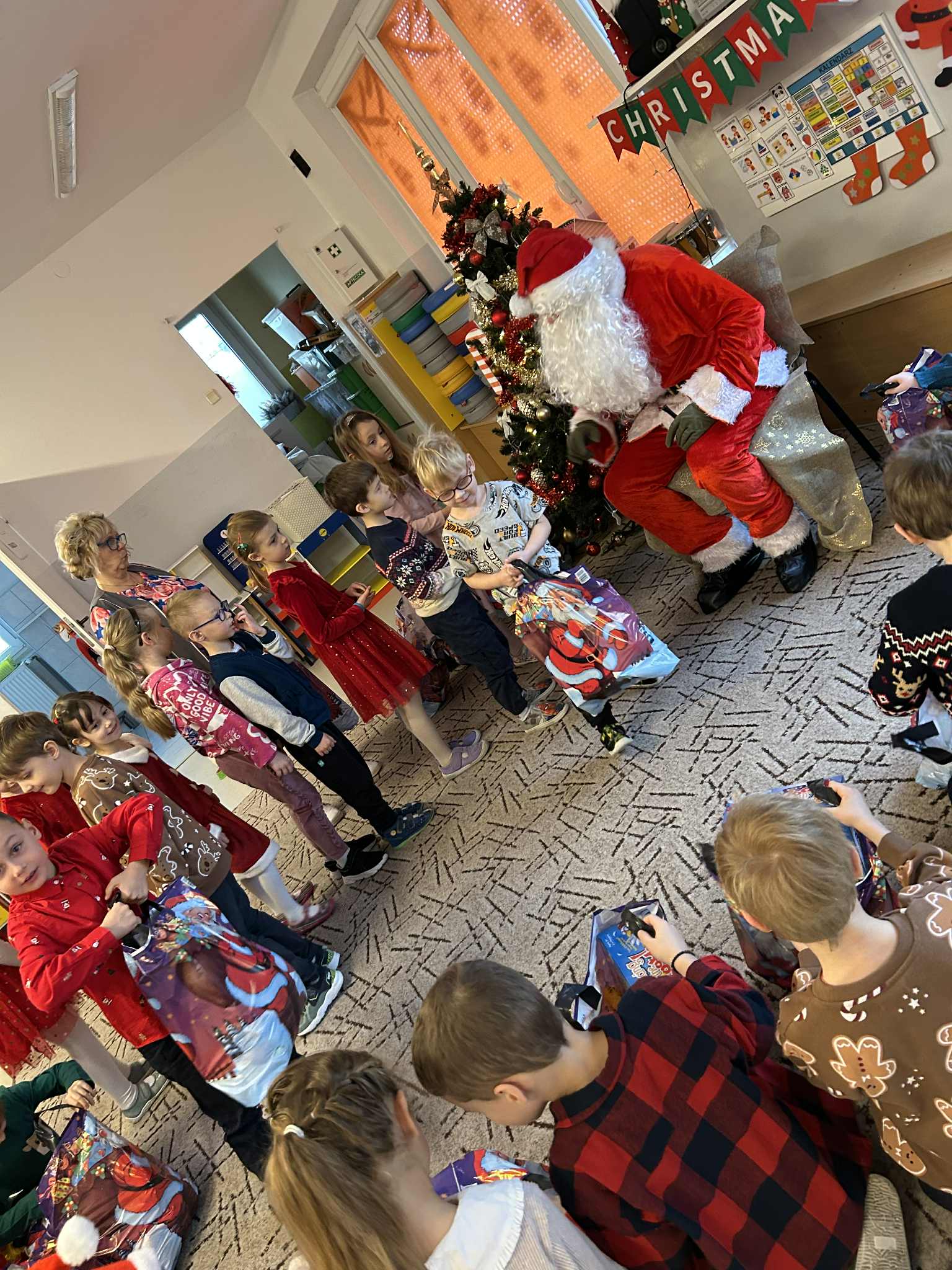 5 grudnia nasze przedszkole odwiedził Święty Mikołaj. Dzieci były bardzo szczęśliwe z tego wyjątkowego spotkania. Z radością zaśpiewały Mikołajowi piosenkę, rozmawiały z nim oraz zadawały mnóstwo ciekawych pytań. Na zakończenie wizyty Święty Mikołaj rozdał dzieciom prezenty, sprawiając im wiele radości i uśmiechu. To był niezapomniany dzień pełen świątecznej atmosfery.